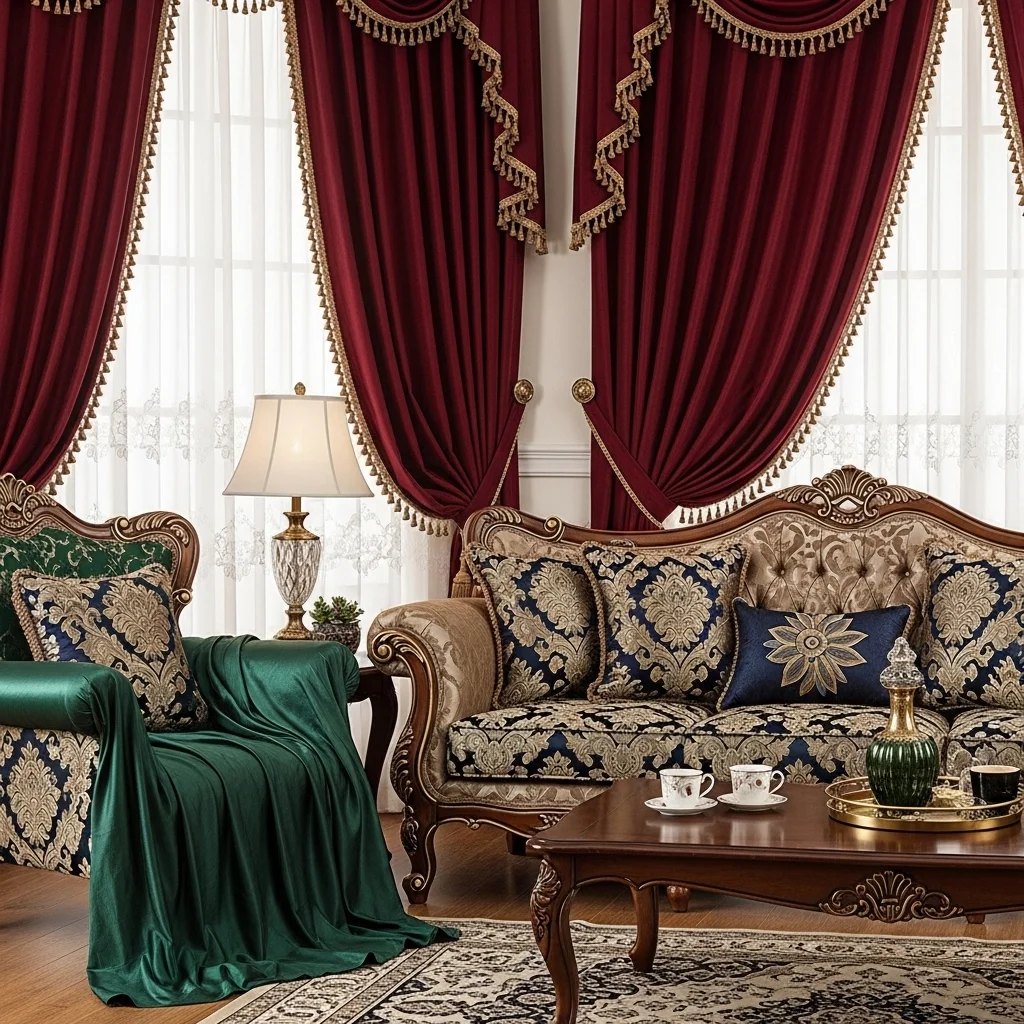 Think velvet, brocade, and heavy silks in deep hues like burgundy, forest green, or navy. Use these textiles for curtains, throw pillows, and upholstered furniture to achieve a luxurious and inviting feel throughout your space.