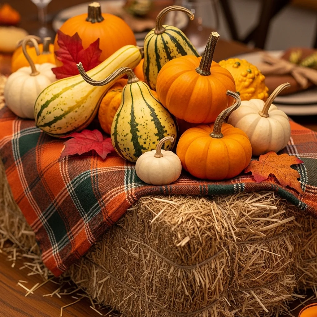For a rustic charm, stack small hay bales as a base and place mini pumpkins and gourds on top. This adds height to your table and serves as a conversation starter. Consider draping a soft plaid or checkered cloth over the hay for additional coziness.