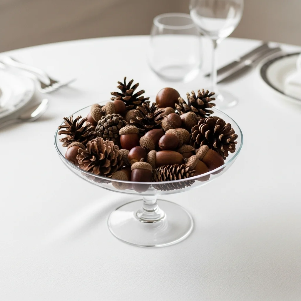 Gather acorns and pinecones and place them in an elegant glass bowl or vase. This natural element adds an organic touch and is perfect for a minimalist approach. Pair it with a simple white tablecloth to allow the earthy tones to pop.