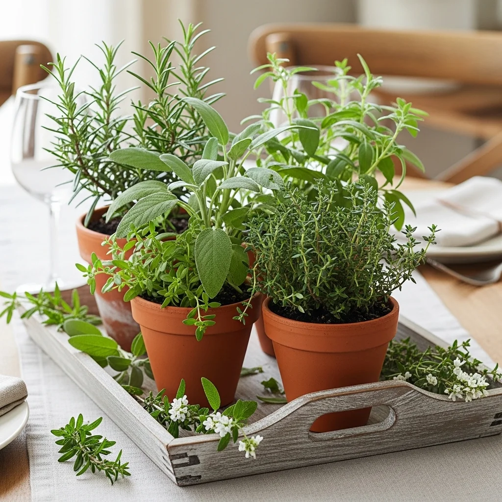 For a centerpiece that is both decorative and functional, use small pots of seasonal herbs like rosemary, sage, and thyme. Group them on a decorative tray for a rustic look. Guests can pluck fresh herbs for their dishes and enjoy their aroma throughout the gathering.