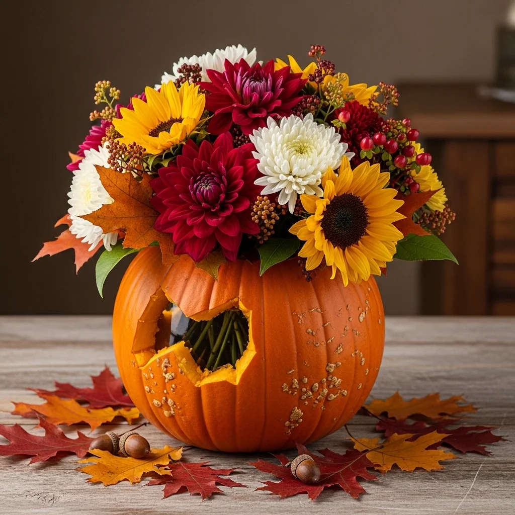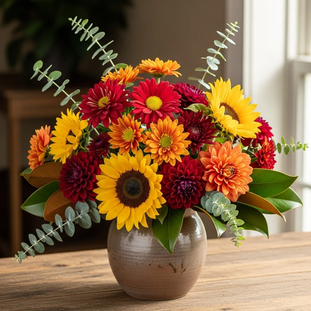 Choose seasonal blooms like chrysanthemums, sunflowers, and dahlias in rich autumn colors. Use a vase that complements the flowers—consider ceramic or glass in earthy tones. For an extra touch, add sprigs of eucalyptus or seasonal greenery like magnolia leaves.
