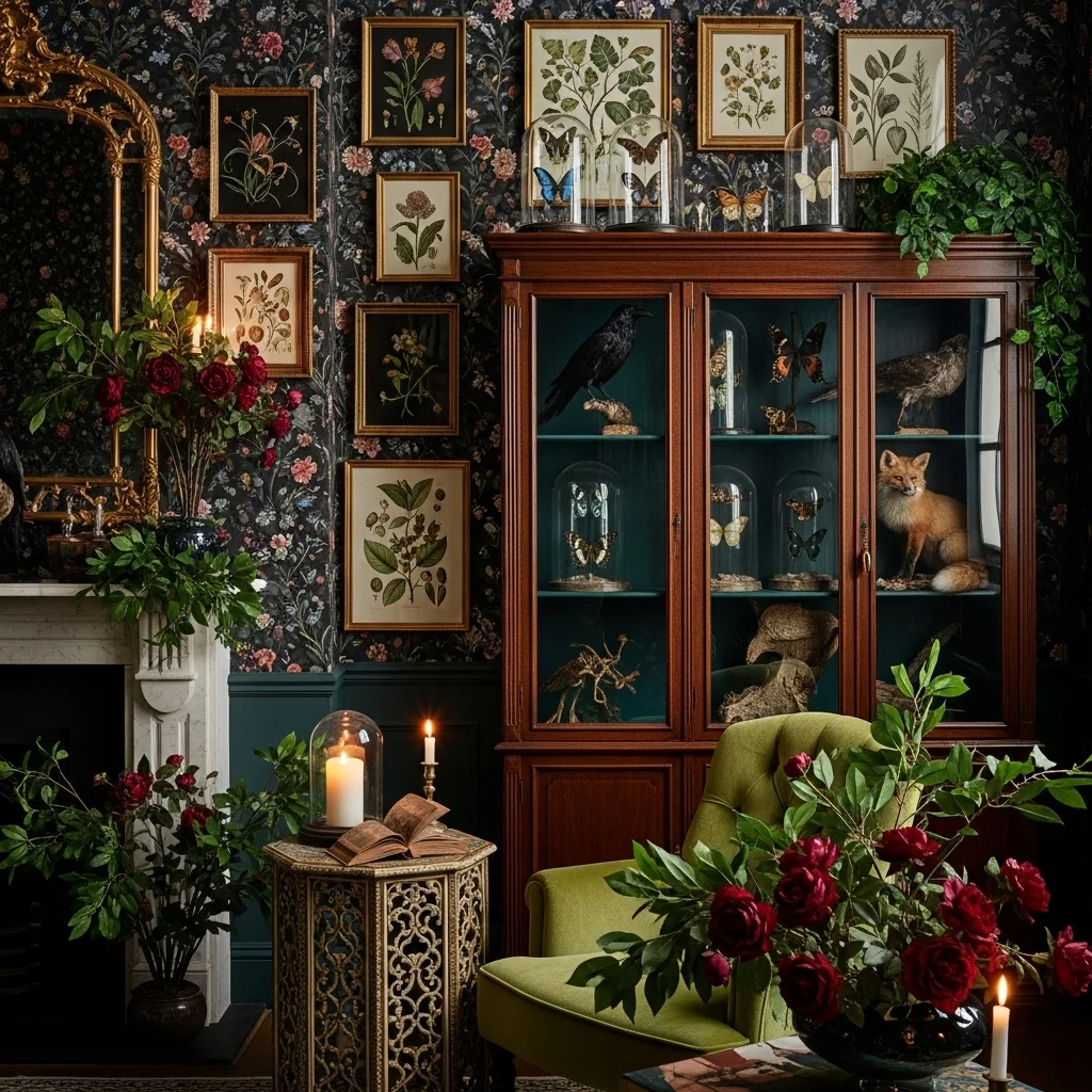 Bring the outside in with nature-inspired decor. Choose botanical prints, dark florals, and even taxidermy accents or faux plants. These elements not only create an organic feel but also further evoke the aesthetic richness of the Gothic revival.