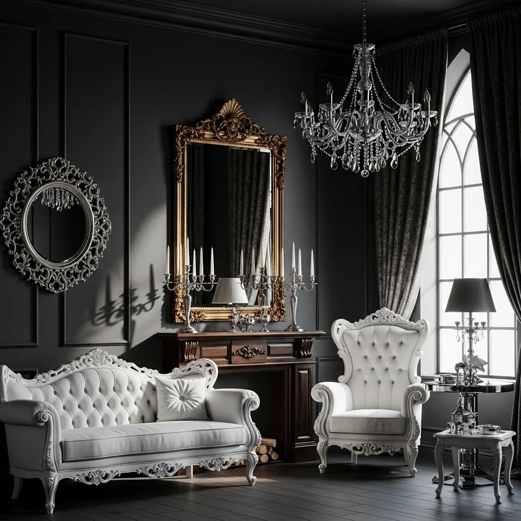 Gothic elegance thrives on contrast. Mix dark colors with lighter accents to create striking visual dynamics. Whether it’s pairing a dark wall with bright white furniture or integrating metallics to catch the eye, the interplay between light and shadow creates compelling intrigue.