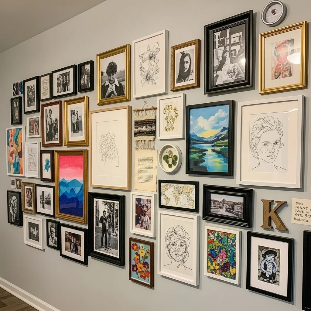 Transform a blank wall into a vibrant gallery by displaying an eclectic mix of photos, art prints, and even some of your own creations. Use mismatched frames to add character, and consider incorporating quotes or letters that hold personal significance. This ever-evolving display allows you to showcase new memories as they occur.