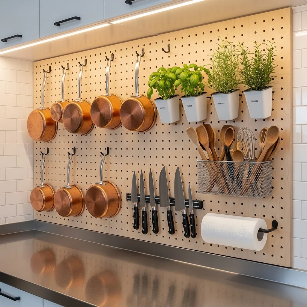 Install a pegboard in your kitchen, workshop, or bathroom for a stylish and functional way to keep tools, pots, or beauty supplies organized and within reach. Customizing pegboard arrangements can also add a personal touch to your decor.