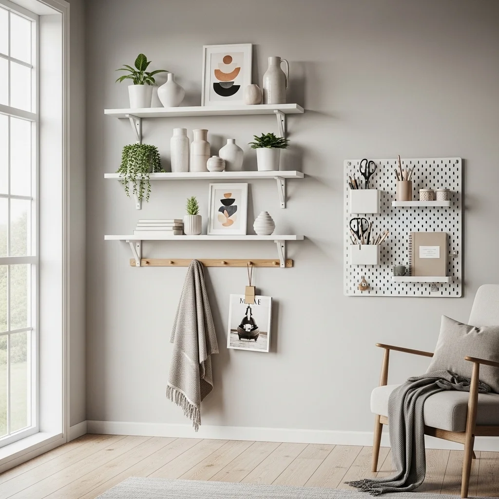 Make use of your wall space! Floating shelves, wall-mounted racks, and pegboards can help you display items or store essentials without taking up valuable floor space. This not only declutters but also adds visual interest to the decor.