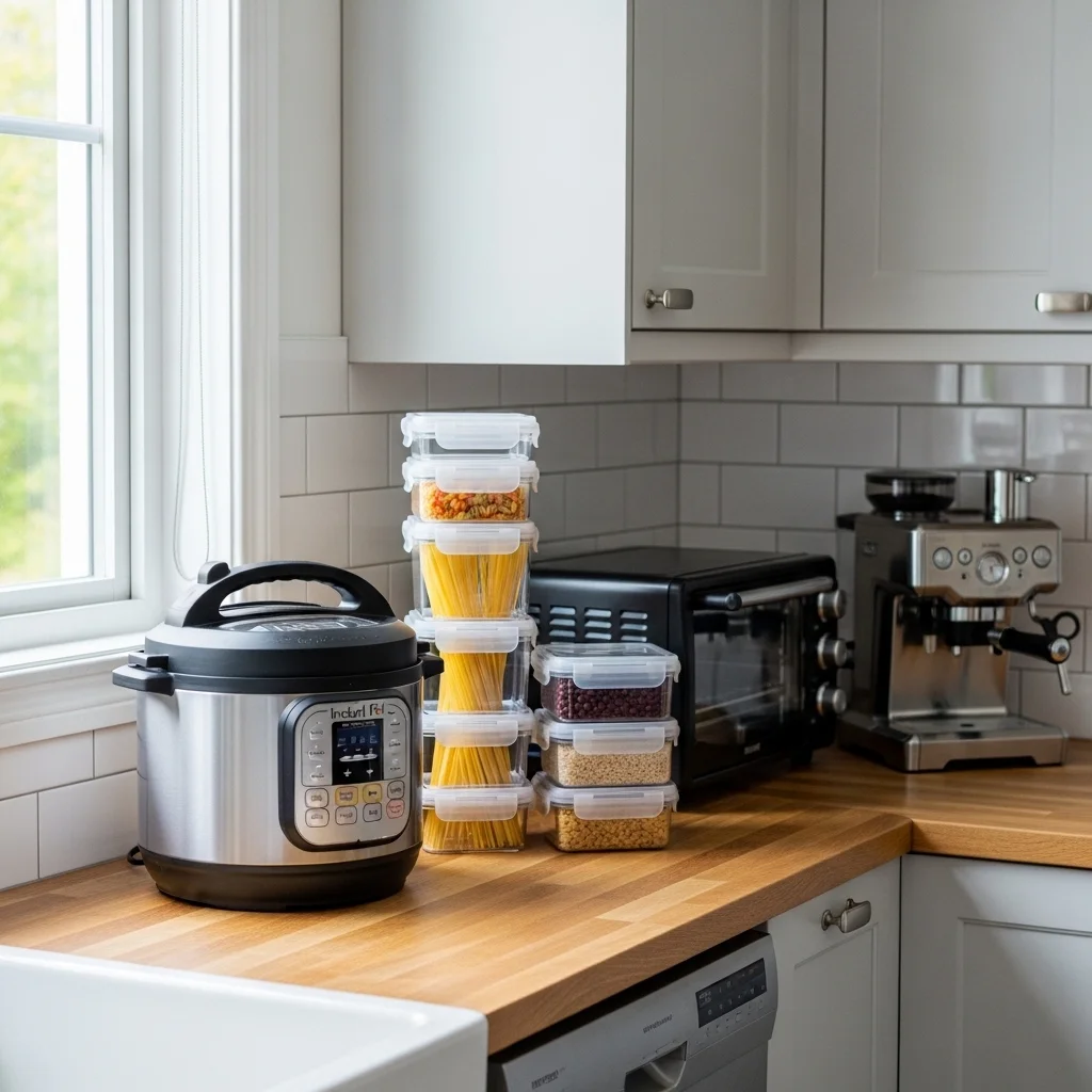 Choose compact and versatile kitchen appliances. For instance, an instant pot or a multi-cooker can replace several different appliances, while stackable containers can help keep the pantry organized without requiring too much room.