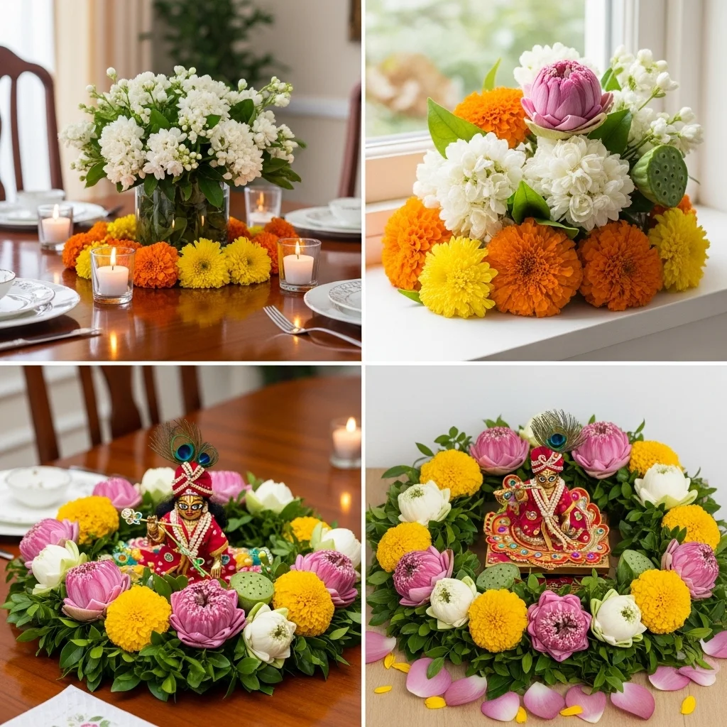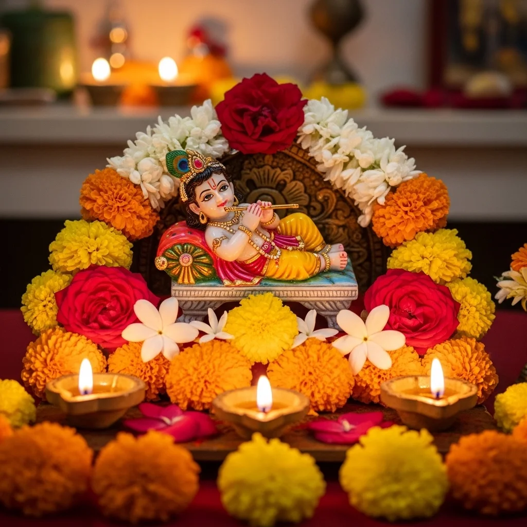Fresh flowers are a timeless decoration. Use clusters of jasmine, marigold, and lotus to create beautiful centerpieces. You can place these arrangements on tables, windowsills, and even around the idol of Krishna for a fragrant and colorful ambiance.
