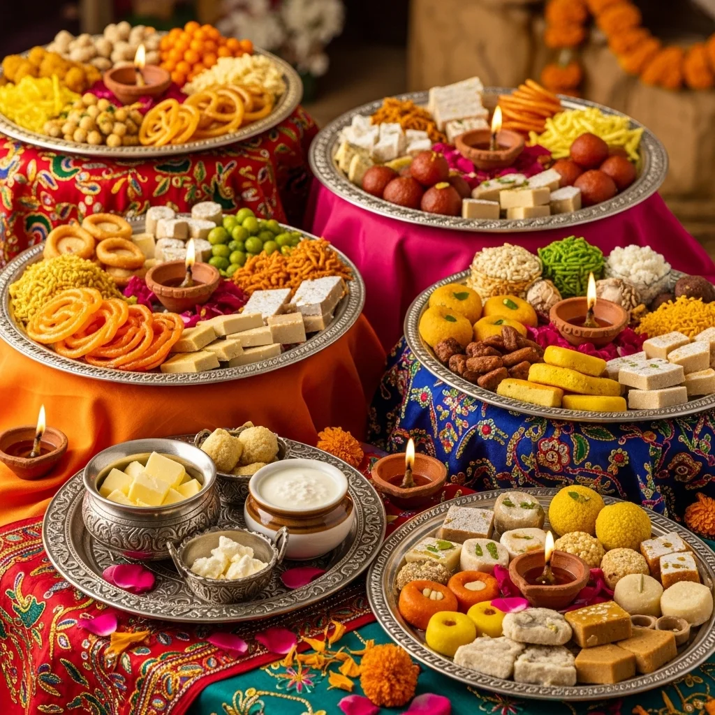 Showcase traditional sweets and snacks on ornate platters. Make this a part of your decor by using vibrant tablecloths. Consider setting up a dedicated area for Krishna’s favorite dishes like butter, curd, and sweets like peda and laddu.
