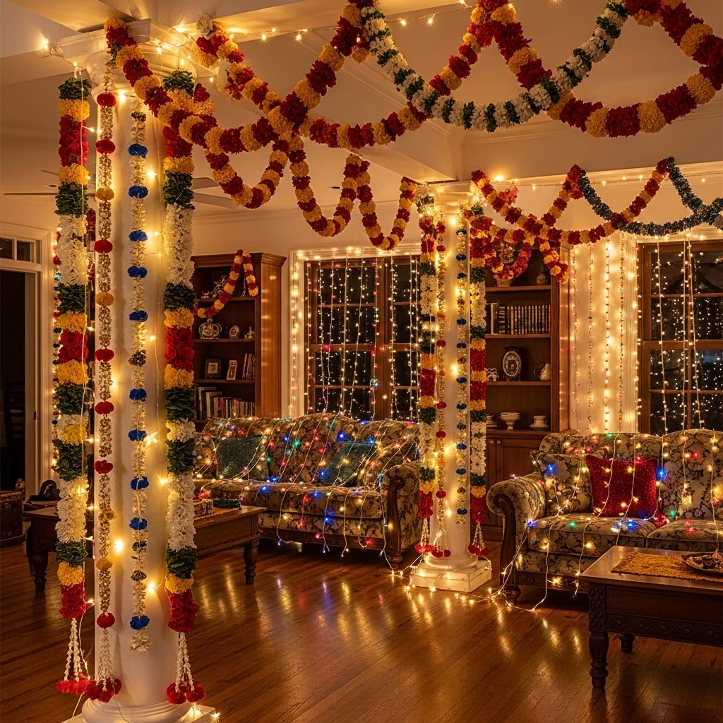 Use garlands made of flowers or colorful beads to adorn walls and pillars. Additionally, string lights can enhance the festive feel in your home. Choose warm white or multicolor lights to drape over furniture, creating a magical glow.