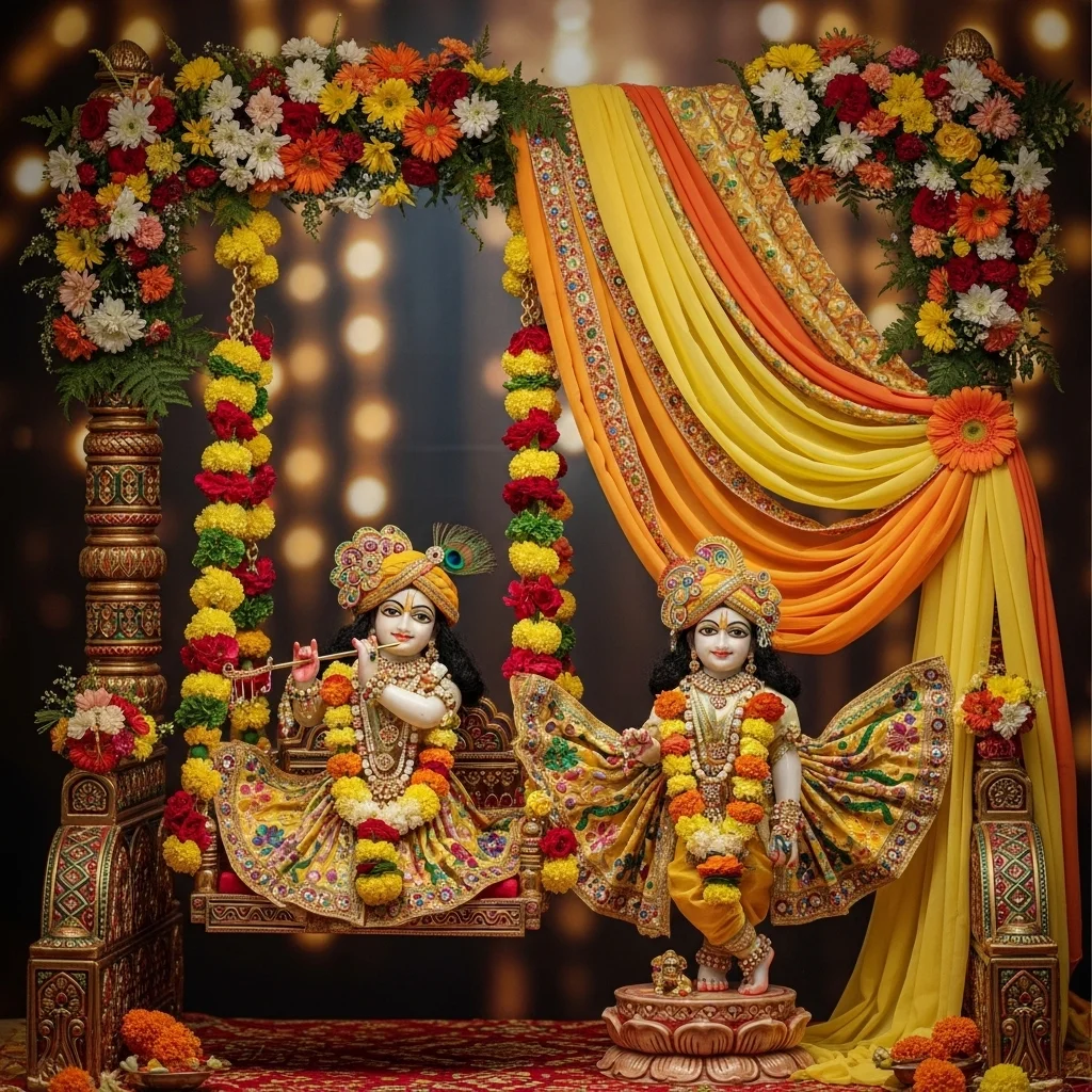 A swing symbolizes Krishna’s playful nature. Create a decorative jhula (swing) using flowers and soft fabrics, and place it near the idol. This not only adds to the authenticity of the celebration but also becomes a perfect focal point for photos.