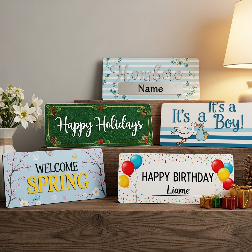 Use name plates in seasonal decorating. Create customized signs for holidays or special occasions. For example, a name plate that says “Happy Holidays” or “Welcome Spring” can bring a seasonal touch to your decor while being functional.