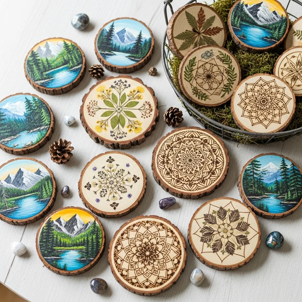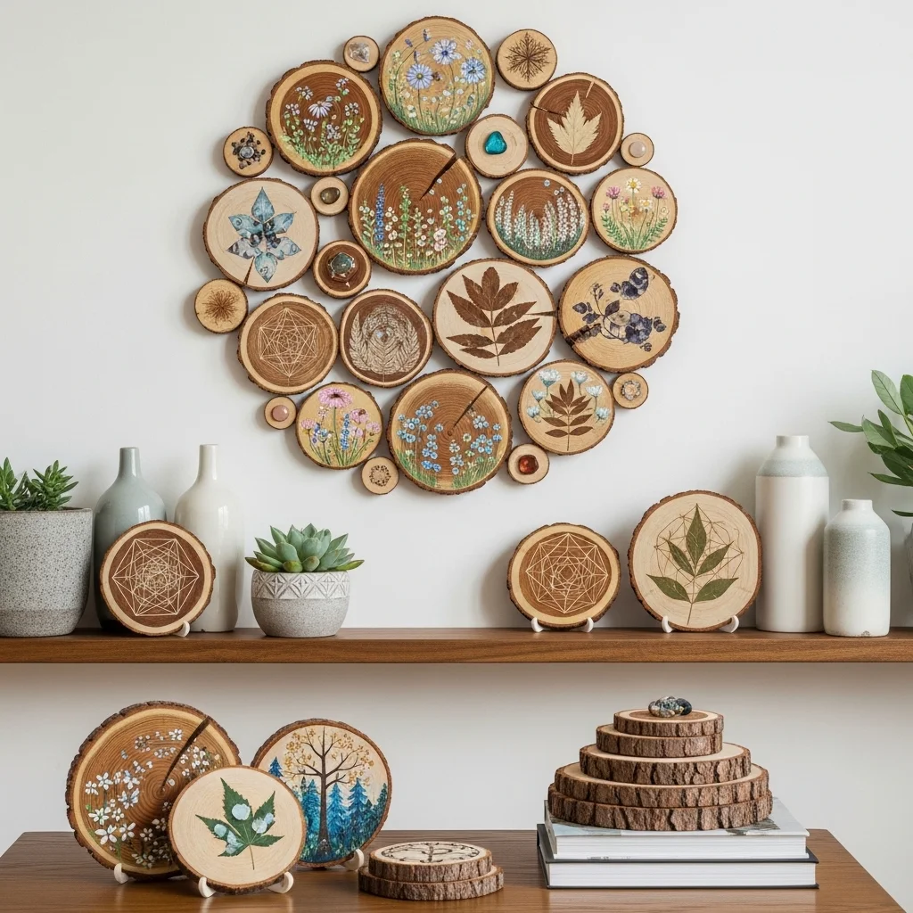 Utilize wood slices as the canvas for paintings or decorative displays. This organic material brings a touch of nature into your décor and can be styled in a variety of ways—such as a circular arrangement or a clustered display.