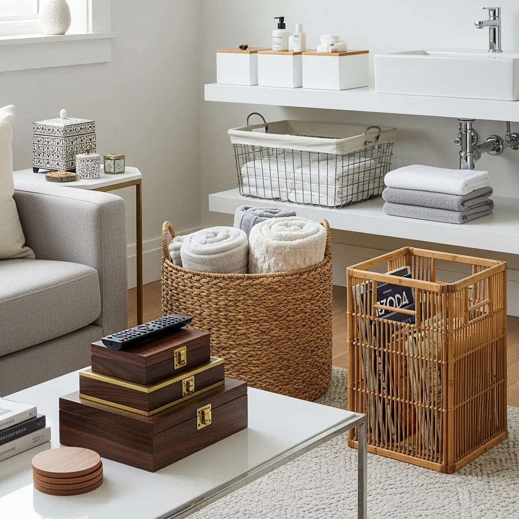 Use decorative baskets or stylish boxes to organize items without making them look cluttered. This is especially effective in open settings like living rooms or bathrooms, where functionality meets aesthetic appeal.