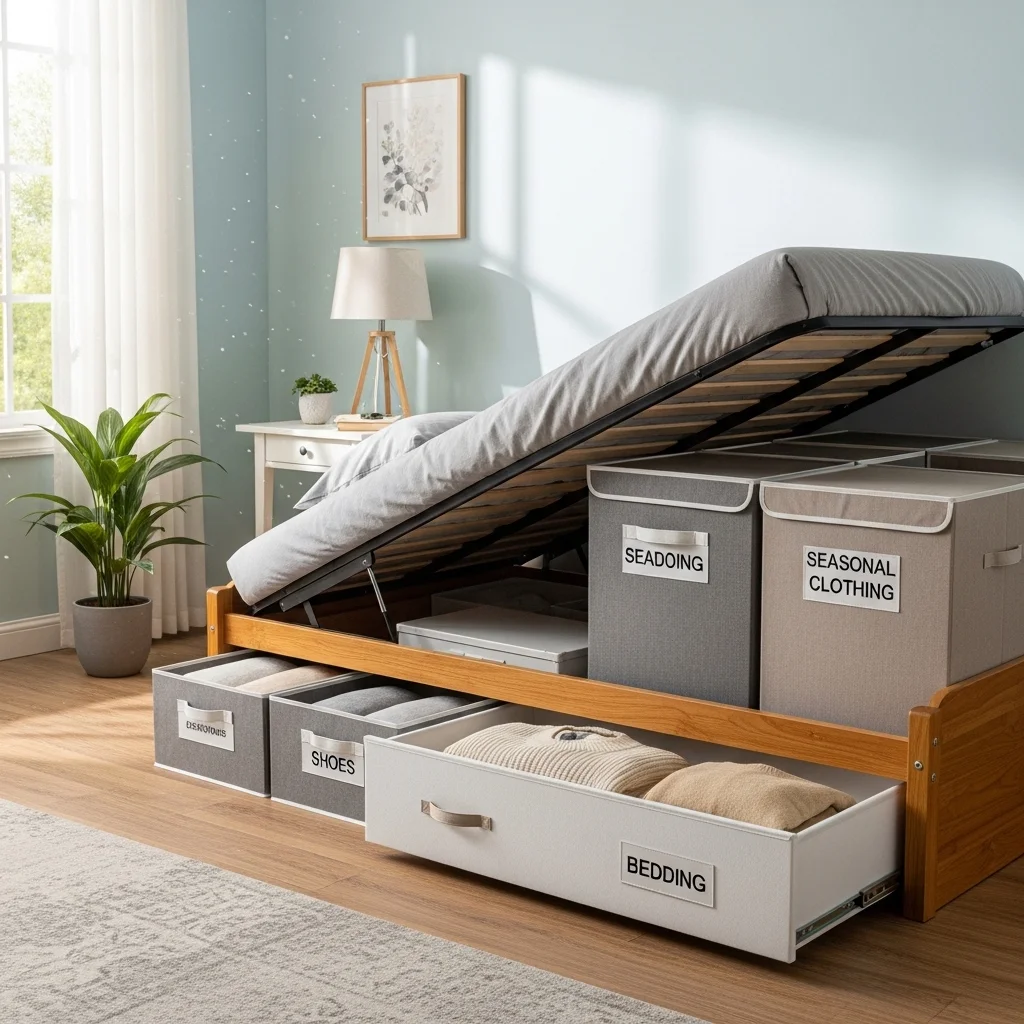 Make use of the space beneath your bed by adding storage bins or drawers. This is perfect for stowing away seasonal clothing, shoes, or extra bedding, keeping your room neat and organized.