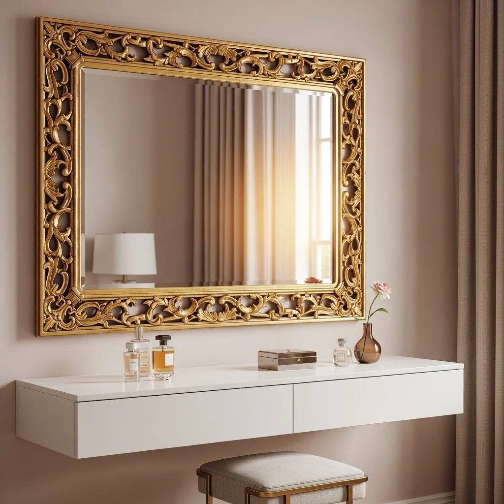 Transform a simple dressing area into a glamorous retreat by adding a vintage mirror. An intricately framed mirror above a minimalist dresser can evoke a sense of timeless charm while serving both functional and aesthetic purposes. This setup can add a personal touch to your personal grooming space.