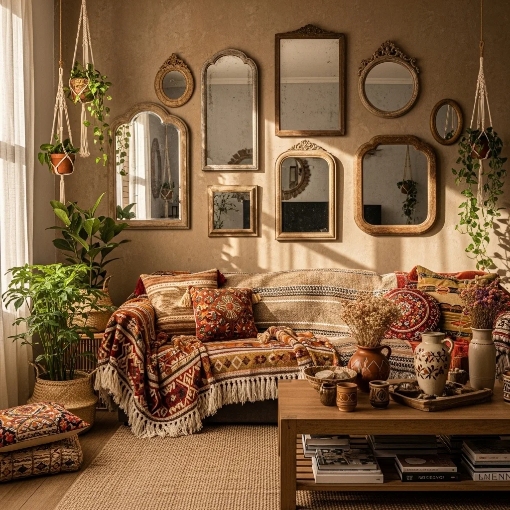 Introduce a bohemian spirit into your decor by mixing vintage mirrors with natural elements like plants, woven textiles, and earthy tones. Layering these elements creates a rich, eclectic vibe that celebrates creativity and individuality.