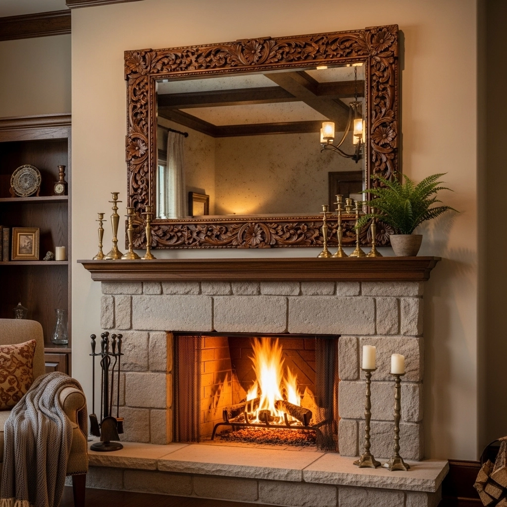 Mount a large vintage mirror above the fireplace to create a stunning focal point. This arrangement can enhance the ambiance and make the room feel more inviting. The mirror also reflects the warmth and flicker of the flames, adding to the overall atmosphere.