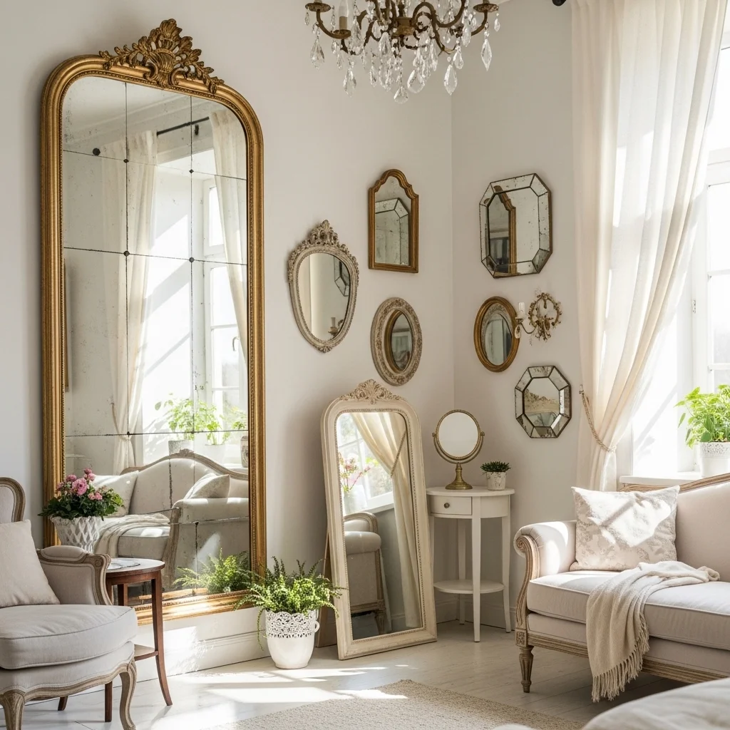 Position vintage mirrors to reflect natural light, improving the brightness and spaciousness of a room. A strategically placed large antique mirror can bounce sunlight around a space, making it feel airy and inviting. This is particularly effective in small or dimly lit areas.