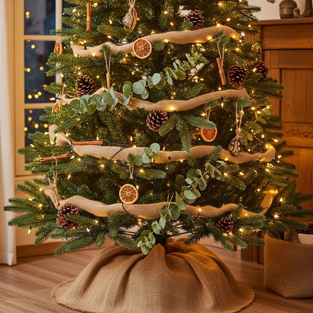 Bring the outdoors in by incorporating natural elements into your tree decor. Use pinecones, dried oranges, cinnamon sticks, and even eucalyptus sprigs to create a rustic look. Consider wrapping your tree with fairy lights and placing a burlap skirt underneath for a cozy, woodland vibe.