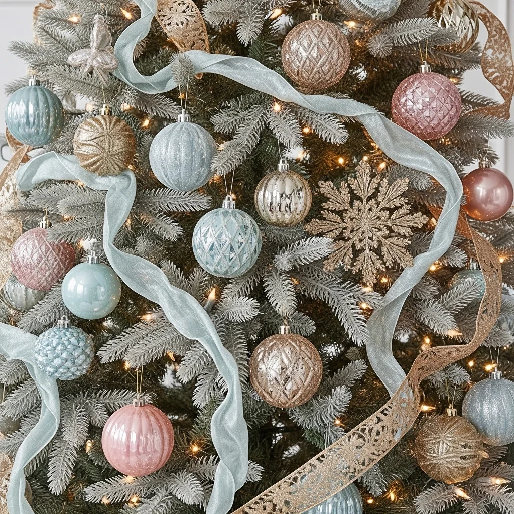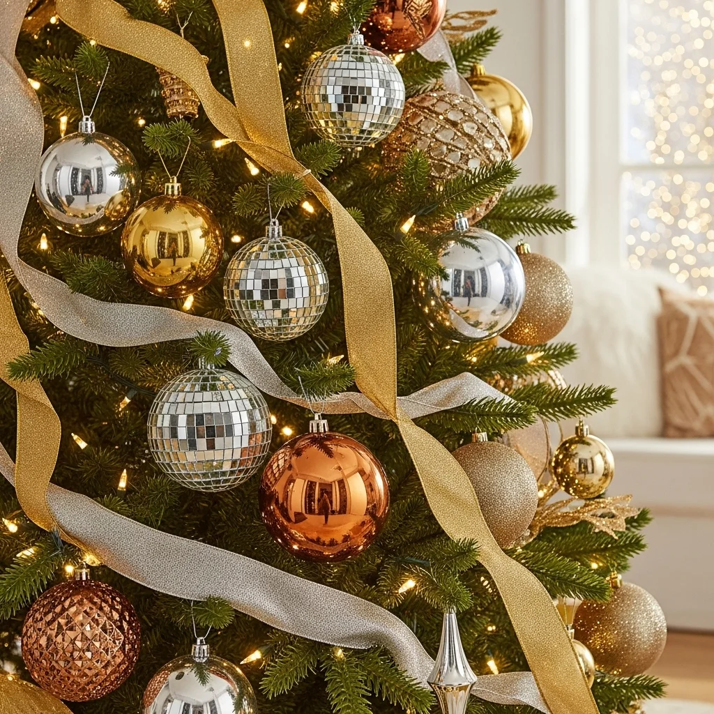 Shimmering metallics can add a touch of glamour to your Christmas tree. Mix gold, silver, and copper ornaments and choose metallic ribbons to drape throughout the branches. Incorporate reflective surfaces like mirrored ornaments to create an eye-catching display that sparkles beautifully in the holiday lights.